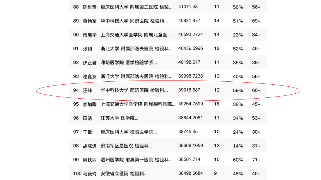 据悉:本排名是基于"全球学者库"的海量论文数据,针对检验医学领域,广泛采集中国学者在海外发表的相关论文,建立基于论文的学者学术影响力评价方法、指标体系和数学模型,然后计算每位学者每篇论文的得分,将其全部论文累加获得每位学者的总积分,按总积分由高到低排序得到百强排名。