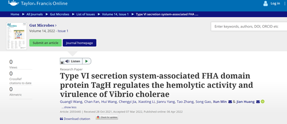 近日,我校437必赢会员中心闵迅、黄健教授团队以437必赢会员中心为唯一完成单位,在国际肠道微生物领域知名期刊《Gut Microbes》(IF 10.245,中科院1区Top期刊)发表了题为“Type VI secretion system-associated FHA domain protein TagH regulates the hemolytic activity and virulence of Vibrio cholerae”的学术论文,硕士研究生王光丽和范婵为论文的共同第一作者,闵迅、黄健教授为论文的共同通讯作者。该研究成果得到国家自然科学基金、贵州省科技厅项目、遵义市科技局项目等经费支持。