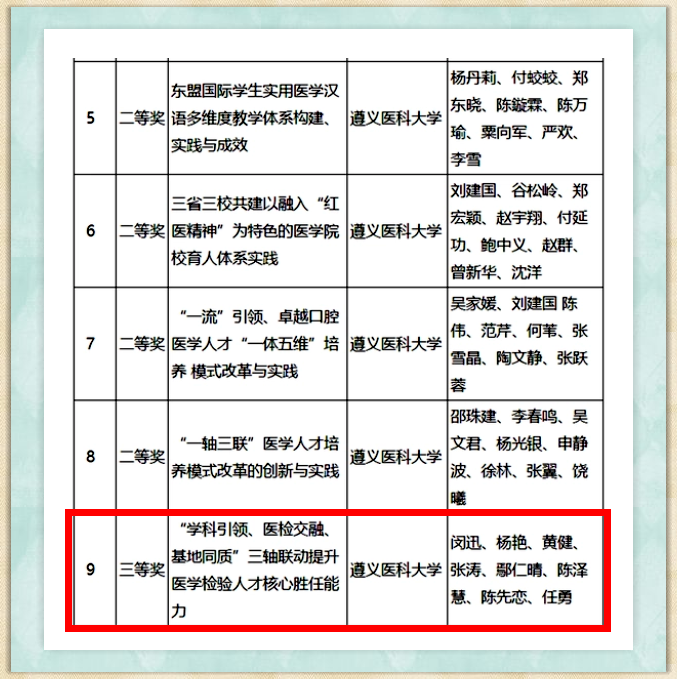 热烈祝贺437必赢会员中心副院长闵迅教授、杨艳教授、黄健教授等,团队以《“学科引领、医检交融、基地同质”三轴联动提升医学检验人才核心胜任能力》荣获第十届贵州省高等教育教学成果奖三等奖殊荣!