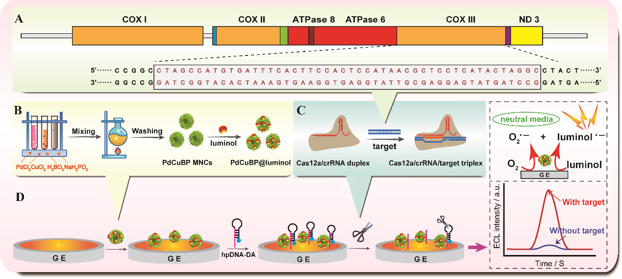 基于CRISPR/Cas12a和PdCuBP@luminol NEs的COX III基因分析的自ECL生物传感器示意图