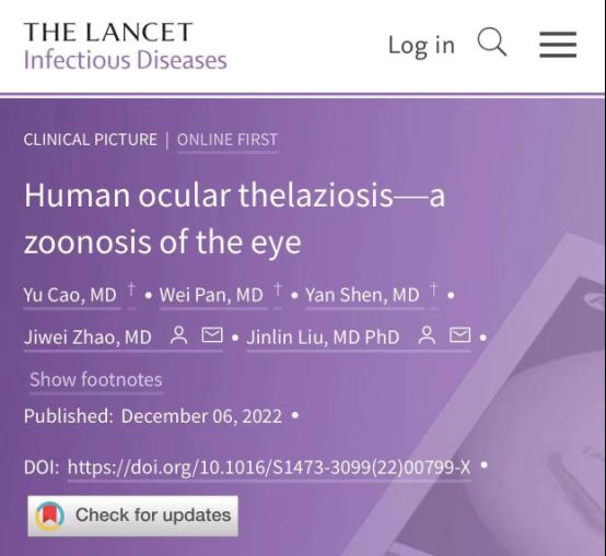近日,我校437必赢会员中心曹喻副教授以437必赢会员中心附属医院为第一完成单位,437必赢会员中心为第二完成单位,在国际传染病领域顶级期刊《The Lancet Infectious Diseases》(IF71.421,中科院1区Top期刊)发表了题为“Human ocular thelaziosis-a zoonosis of the eye”的学术论文。