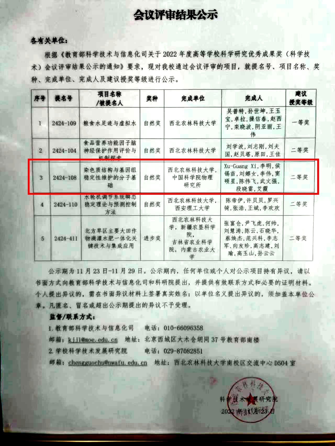 热烈祝贺我院段晓雷博士(第四完成人)教学成果《染色质结构与基因组稳定性维护的分子基础》,继2022年3月获得陕西省高等学校科学研究优秀成果奖一等奖荣誉后;于2022年11月以(第九完成人)再次荣获2022年度教育部高等学校科学研究优秀成果奖二等奖荣誉!