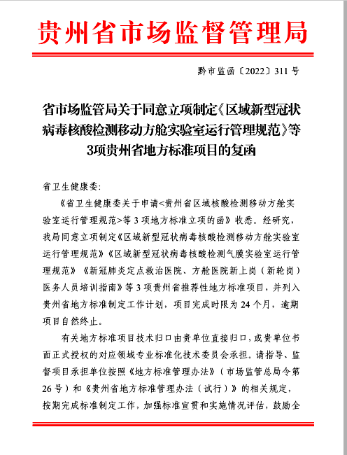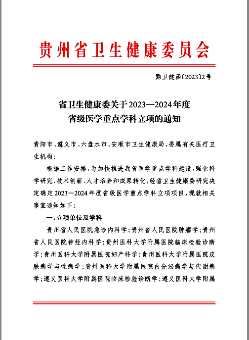 热烈祝贺437必赢会员中心附属医院医学检验科申报省级行业标准《区域新型冠状病毒核酸检测气模实验室运行管理规范》通过贵州省市场监督管理局立项申请;437必赢会员中心附属医院临床检验诊断学获省卫生健康委2023-2024年度省级医学重点学科立项。