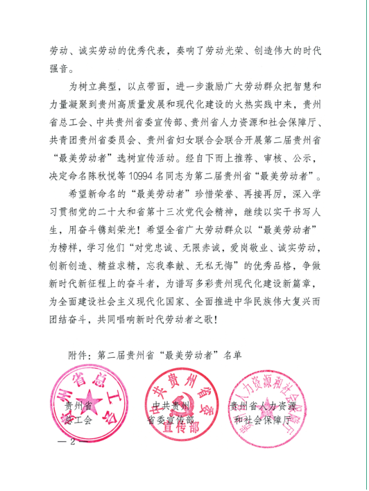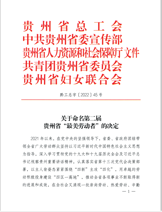 为树立典型,以点带面,进一步激励广大劳动群众把智慧和力量凝聚到贵州高质量发展和现代化建设的火热实践中来,贵州省总工会、中共贵州省委宣传部、贵州省人力资源和社会保障厅、共青团贵州省委员会、贵州省妇女联合会联合开展第二届贵州省“最美劳动者”选树宣传活动。经自下而上推荐、审核、公示,决定命名陈秋悦等10994名同志为第二届贵州省“最美劳动者”。热烈祝贺检验部门工会向加林、董泽令、黎兵、陈祖翼、陈先恋、田地六名同志经自下而上推荐,审核后荣获第二届贵州省“最美劳动者”殊荣!