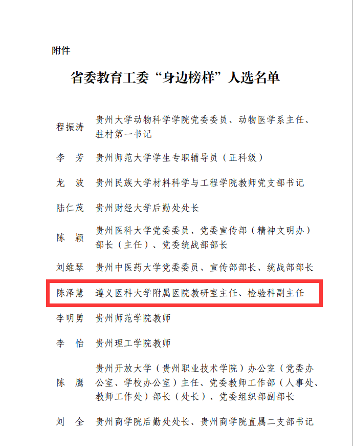 近日,省委教育工委公布了“身边的榜样”评选结果,我校附属医院陈泽慧同志荣获此荣誉称号。