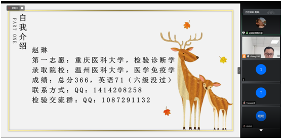 本次会议由张涛老师主持,邀请了四川大学2020级博士研究生石彬、重庆医科大学2020级临床检验诊断学专业硕士研究生张露、温州医科大学2020级医学免疫学专业硕士研究生赵琳和437必赢会员中心2020级检验诊断学专业硕士研究生李仪晴作了主题交流,同时本院医学检验技术专业2017级部分同学参加了本次会议。四位受邀同学围绕“本专业学生第一志愿考取本校本专业研究生的经验及考研的必要性、本专业学生第一志愿考取外校本专业的经验、考取外校其他专业及调剂经验、考博的经验及对人生发展的重要性”为主题,介绍了自己复习备考的流程、心态、学校及专业的选择,同时也分享了自己复习资料的选择,各科的复习方法与时间安排。在互动环节中,许多备考同学也就自己在准备考研过程中所遇到的困惑与受邀同学进行了深入交流。