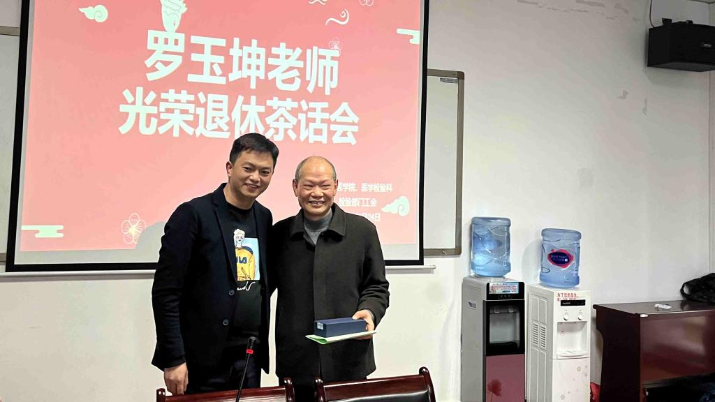 茶话会开始,首先由工会主席董泽令代表全体教职工为罗玉坤同志送上温馨祝福和诚挚寄语,并简要回顾罗玉坤老师的工作历程。随后,院科罗开源、闵 迅、陈泽慧、张绍基、杨艳、骆科永、蒋火刚、祁莹、付书南、杨小理等众多老师及已离退休老同志纷纷对罗老师精湛的临床检验基础专业技能、一丝不苟,为人谦和,和蔼有加,淡泊名利的工作和生活作风给予了高度评价。大家对罗老师长期以来在科室党建、业务发展、学科建设等多个方面所做的工作和积极贡献表示诚挚的敬意和谢意!并祝愿罗老师在新的生活中身体健康,万事如意!也能够常回家看看!
